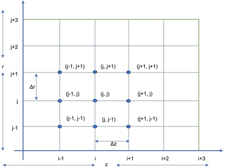 In Figure 2, & are constant mesh sizes along z and r directions respectively. We need an algorithm to find single values at next time level in terms of known values at an earlier time level. A forward difference approximation for the first order partial derivatives of T and C. And a central difference approximation for the second order partial derivative of T and C are used. On introducing finite difference approximations for: