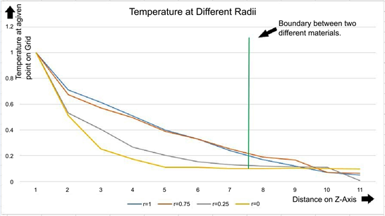 At this point of intersection, i.e. the plane of heat continuity, when the heat transfer occurs, the temperature at the last grid point along any radius of the first material is approximately equal to the temperature at the first grid point in the second material. Similarly, the concentration at the last grid point along any radius of the first material is approximately equal to the concentration at the first grid point in the second material. So, the heat continuity equation can be written as follows: