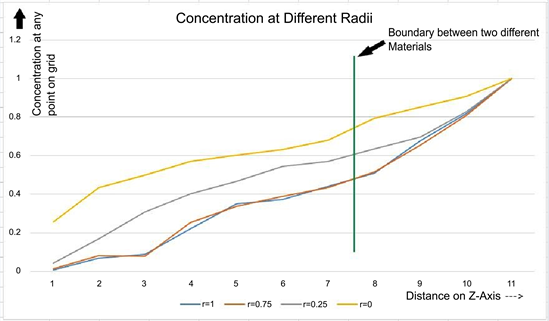 For the purposes of coming up with a numerical solution for the problem, the radius of the capillary porous composite cylinder is 1.0. The partial derivatives are approximated by following formulas: