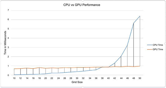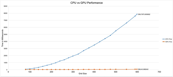 We run the test for N running from 10 to 599 with increments of 30 and generally, the GPU performed the calculations a lot faster than the CPU.