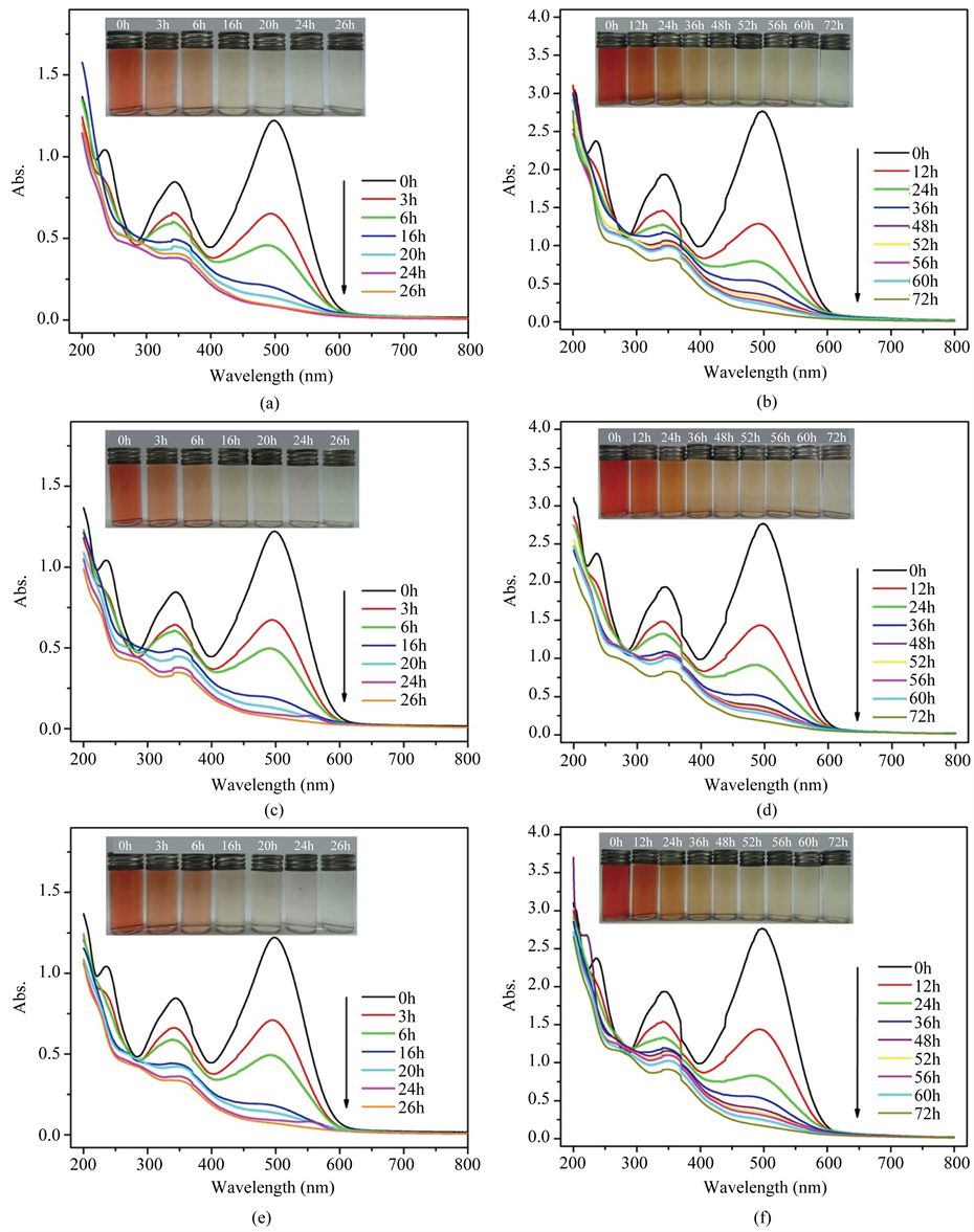 Figure 4. UV-Vis absorption spectra of CR solutions (25 or 50 mg∙L-1) before and after treatment with as-synthesized LnBaCo2O5+δ (Ln = Eu, Gd, and Sm) powders at different time intervals under ultraviolet light irradiation at room temperature: (a) EuBaCo2O5.52, CR (25 mg∙L-1); (b) EuBaCo2O5.52, CR (50 mg∙L-1); (c) GdBaCo2O5.42, CR (25 mg∙L-1); (d) GdBaCo2O5.42, CR (50 mg∙L-1); (e) SmBaCo2O5.54, CR (25 mg L-1); (f) SmBaCo2O5.54, CR (50 mg∙L-1). The insets are the photographs of CR solutions (25 or 50 mg∙L-1) before and after treatment with as-synthesized LnBaCo2O5+δ (Ln = Eu, Gd, and Sm) powders at different time intervals, respectively.