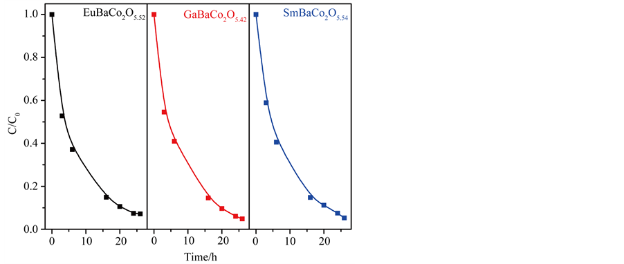an indicator for the photocatalytic activity. After photocatalysis experiments, we found that double-perovskite oxides LnBaCo2O5+δ could remove the CR effectively, which mean they have photocatalytic properties. Figure 3 shows the photodegradation rate of CR solutions with different initial concentration in the presence of samples. From Figure 3(a), it is easy to see that the degradation rate of CR solutions (C0 = 25 mg∙L−1) by EuBaCo2O5.52 is rapid at the first 16 h of the reaction time. Following the rapid degradation, the rate decreased and the decolorization efficiency was 92.6% for 24 h. The other two samples, GdBaCo2O5.42 and SmBaCo2O5.54, display similar photocatalytic degradation rates of CR comparing with EuBaCo2O5.52. In general, the catalytic activity is tightly related to the structure of the catalyst [34] . Double-perovskite oxides LnBaCo2O5+δ is a kind of distorted perovskite structure which is often caused by the excessive absence of O2− ion. The same structure can explain the phenomenon of similar photocatalytic property of EuBaCo2O5.52, GdBaCo2O5.42 and SmBaCo2O5.54. And likewise, as shown in Figure 3(b), because of the same reason, the three samples have similar photocatalytic degradation rates of a higher concentration of CR solutions (C0 = 50 mg∙L−1) except the time of photodegradation extended to 60 h.