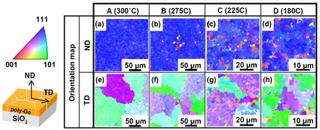 The crystal (111)-orientation planes and average the grain size of poly-Ge for thin films A, B, C and D were characterized using EBSD measurement. Figures 8(a)-(d) show the crystal (111)-orientation planes in the normal direction (ND). For the sample A, poly-Ge thin film has highly (111)-orientation planes. Figure 8(e)-(h) show the crystal other orientation plane in the transverse direction (TD) and indicate that the average grain size of poly-Ge thin film decrease with the annealing temperature decreasing. This result suggests that the a-Ge insertion layer and the GeOx diffusion control interlayer increase the nucleation frequency and promote poly-Ge thin film crystallization. Nevertheless, Figure 8(h) indicates that the sample D has larger grain with approximately 10 μm even under the 180˚C annealing temperature.