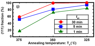Figure 4. The (111)-orientation planes fraction reach over 90% by combining the lower Ta (325˚C) and longer tair (30 min).