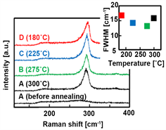 In our second experiments, the thin films A, B, C, and D were annealed at 300˚C, 275˚C, 225˚C, and 180˚C, respectively. Nomarski optical microscopy suggested the completion of the layer exchange for all thin films after annealing time for 100 h. In addition, Raman spectra in Figure 6(a) show the largest sharp peak at around 292 cm−1 for all thin films after annealing. These results indicate the crystallization of a-Ge thin film is better, although the sharp peak shift to the lower wave number compared to the crystal Ge actual sharp peak (~300 cm−1) [18] . These larger wave number shifts are not entirely understood, but they are possibly due to the residual Al atoms (~0.5%) in Ge thin film. The insert figure in Figure 6(a) shows the full width at half maximum (FWHM) of Raman spectra sharp peak as a function of the annealing temperature. The FWHM is independent on the annealing temperature, whereas the FWHM increases with the annealing temperature decreasing for the solid phase crystallization of a-Ge thin films [19] . This result suggests that Al induced crystallization process is