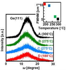 The (111)-orientation planes ratio and the average grain size of poly-Ge thin film were calculated using EBSD measurement. Figure 9(a) and Figure 9(b) show the typical (111)-orientation planes ratio and the average grain size of thin film D. Figure 9(a) indicates that poly-Ge thin film principally consists of planes with tilting within 10˚ of the exact (111)-orientation planes. This result agrees with XRD rocking curve in Figure 7. The whole (111)-orientation planes ratio was defined as the integrated values of the area ratios of exact (111)-orientation