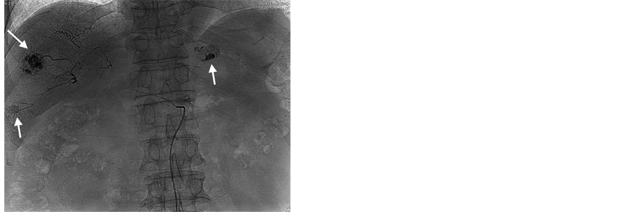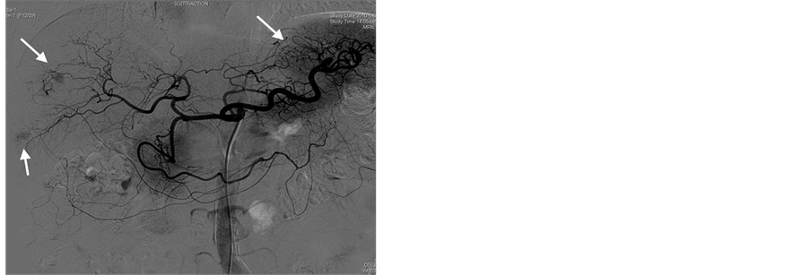 After splenic MWA, a 5.0 French catheter (Terumo, Tokyo, Japan) was inserted into the femoral artery with the Seldinger method after local anesthethia, celiac angiography and selective hepatic arterial angiography were routinely performed to observe the tumor blood-supply, distribution of hepatic arteries and collateral circulation routes (Figure 1(a)), the tip of the catheter was placed at the feeding artery of the tumor, and embolization was performed using an emulsion mixture of lipoidal ultra-fluid (Guerbet, France), perarubicin (50 mg/m2) and DDP (80 mg/m2). The maximum dose for embolization was based on the size of the tumor, blood supply and hepatic function of the patient. When the tumor was filled well with emulsifier, the embolization was terminated (Fig- ure 1(b)).
