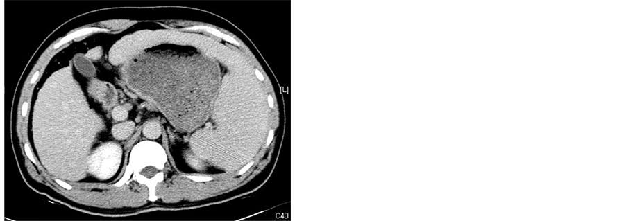 Specifications of intravenous anesthesia were administered using propofol via the peripheral vein. The spleen was accessed percutaneously via the left subcostal approach under CT guidance. An applicator (water-cooled antenna: diameter 1.7 mm, model Ⅲwith high-power, made by Qi Ya Medical Treatment Facility Limited Company, Nanjing, China) was placed in the lower part of the spleen. The applicator was activated at 60 - 100 W for 5 - 10 minutes according to the results of a previous in vivo study [11] [12] . When withdrawing the applicator, another MWA emitting for 1 - 3 minutes was performed to prevent bleeding from the needle track. After the emission, the applicator was pulled back for about 2 - 3 cm more than 3 cm from the splenic surface. Two to three overlapping areas from the middle to inferior part of the spleen were ablated with one insertion of applicator. The emission facility was produced by Qi Ya Medical Treatment Facility Limited Company, Nanjing, China (Frequency: 2450 MHz; Output power: 0 - 120 W; Precision of temperature control: ±0.1˚C; Discharge waveform: continuous wave).