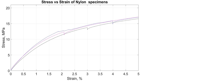 In total 3 Nylon® samples were tested in tensile. The results from these tests are shown in Figure 6. From these results the elastic modulus was determined to be 900 MPa for 0% to 0.5% strain. These results are similar to the properties of Nylon-6 or Nylon-66 with 3.5% wetting, which occurs at a relative humidity of 60% to 70% [11] . This air humidity is the same as the environmental condition of the tensile tests. The resulting mechanical properties of the Nylon® are shown in Table 2.