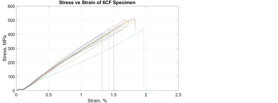 The results from the 6CF specimen tensile tests are displayed in Figure 7. It can be seen that the strain of the 6CF specimens varies roughly between 1.3% and 2.0%. The ultimate tensile strength at failure varies between 370 MPa and 520 MPa and has an average of 464.4 MPa. The first non-linear part of the graph occurred because the specimens were not pre-strained in the clamps. The elastic modulus was calculated by looking at the slope of the stress-strain curve from Figure 7 and was calculated to be 35.7 GPa. This is the elastic modulus of the specimen as a whole. To determine the elastic modulus of the fibres, the elastic modulus of one single CFRTP layer was determined by using Equation (2).