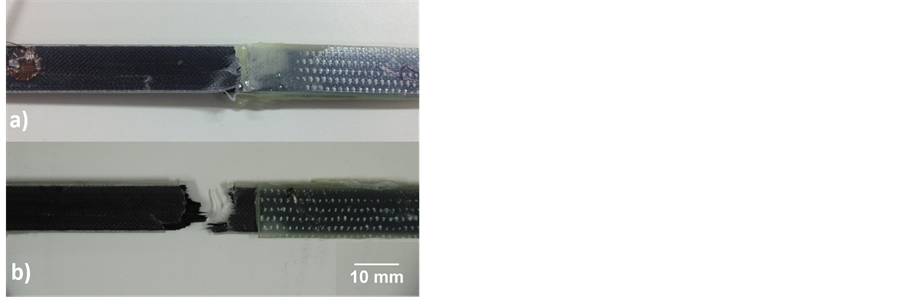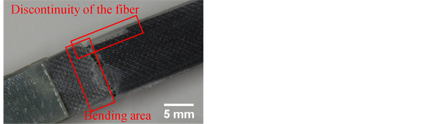 As expected, the specimen failed at the area where the discontinuity was located as can be seen from Figure 10. The total length of the discontinuity was 7 mm and the fracture occurred at the place where the fibres ended.