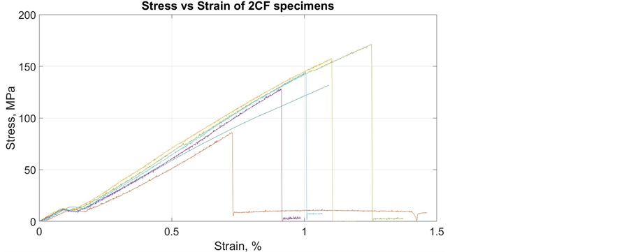 Figure 9. Stress-strain curve of 2CF specimen undergoing a tensile test with a constant strain of 2 mm/min. Specimens were tested until failure occurred.