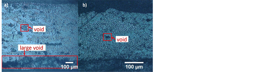 Figure 12. Cross-sections of the CFRTP specimens. (a): It shows a cross-section of the 6CF specimen. (b): It shows the cross-section of a 2CF specimen. As can be seen, there is a lot more void area visible in (a) than in (b).