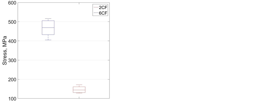 Figure 13. Box plot showing the data scattering of the ultimate tensile stress for 6CF (blue) and 2CF (red) specimens.
