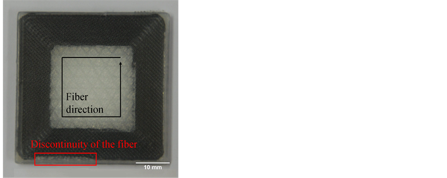 The sample is a square of 45 mm × 45 mm × 3 mm in length, width and thickness respectively. The carbon fibres in the CFRTP are continuously aligned along the edge of the square. The centre of the square is pure matrix material, which is Nylon FFFR in this study. The FFF stands for Fused Filament Fabrication. For the rest of the paper the matrix material will be referred to as Nylon®.