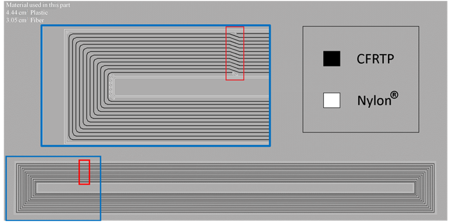 Figure 2. Sketch of the printed carbon fibre reinforced Nylon® specimen. The sketch is made with the Eiger® software and shows an internal view of the printed sample. The discontinuity in the carbon fibres can be seen clearly here and is highlighted by the red rectangle.