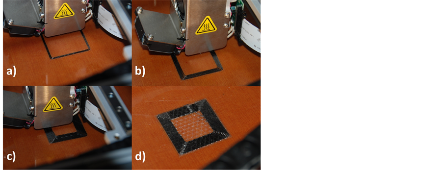 Figure 3. The printing process of the specimen from Figure 1. (a): The first 2 CFRTP continuous lines are printed. Here no Nylon® layer was printed. (b): Sample after 4 CFRTP lines. Note that the printing process starts on the outside of the square and ends in the centre. (c): Sample during the printing of the last CFRTP line. (d): Finished sample printed by the Mark One®.