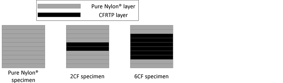The second type has 2 layers of Nylon®, then 6 layers of CFRTP, and then 2 layers of Nylon® again. These specimens are from now on referred to as 6CF specimens.