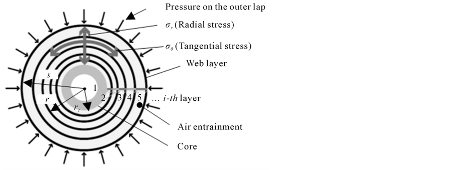 In this research, we predict the occurrence of defects by first theoretically determining the internal roll stress, from which we determine the optimal rewinding conditions. Therefore, to determine the internal roll stress, we assume the web that has been wound into a spiral to be a series of thin walled concentric cylinders, such as that shown in Figure 3. The wound roll model consists of alternating layers of web and air film entrained between the web layers.