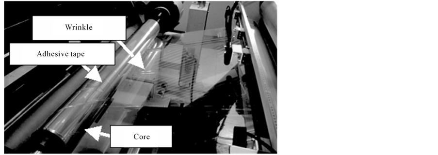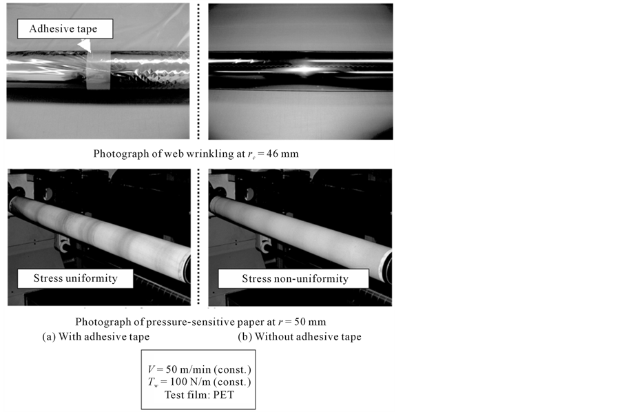 Figure 6 compares the experimental results of the tapeless method proposed in this research and the conventional adhesive tape method. In the experiment, a web of PET film was rewound to a maximum roll diameter of 200 (mm). During rewinding, we inserted a pressure sensitive paper when the roll diameter reached 100 (mm) to visually observe the stress profile in the width direction after rewinding. The photograph shows the results when the web was later unwound. From the results, we confirmed changes in internal stress and wrinkles when using an adhesive tape, whereas we did not observe any wrinkles or changes in stress when using the tapeless method. Therefore, we concluded that it is possible to prevent wrinkles at the outset of rewinding mentioned earlier using the tapeless method.