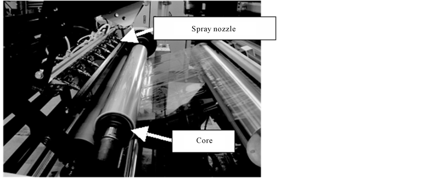 Web splicing during rewinding typically uses adhesive tape, as shown in Figure 4, so differences in adhesion between the roll core and adhesive tape are likely to cause width direction tension variation in the web. Moreover, as the roll diameter increases, a high radial stress occurs near the innermost layers of the roll, meaning that thickness variation in the adhesive tape increases the risk of generating an uneven stress profile in the web width direction. To avoid this type of defect, we must consider the influence that the position and thickness of the adhesive tape will have on the internal roll stress ahead of time and ensure that wrinkles do not occur in the web immediately before rewinding. The condition of the web during transport, however, contains many items that cannot be numerically compared. Moreover, there are various types of adhesive tapes, so it is nearly impossible to quantitatively handle these characteristics. Therefore, for the rewinding machine used in this research, we selected a machine that uses a water droplet spray (tapeless method)―an example of which is shown in Figure 5―instead of one that uses an adhesive tape.