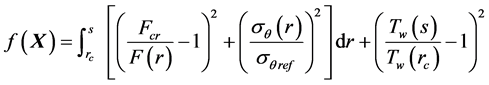 When designing the objective function, we set the circumferential stress to be a non-negative close to zero, and set the difference between interlayer friction and critical friction to be a positive close to that approaching zero over a wide range of radial positions in the roll. Moreover, we set the difference between stress at the start of rewinding and at the end of rewinding as close to zero as possible to ensure stability during web splicing. Therefore, the objective function that must be minimized is defined by the following equation.