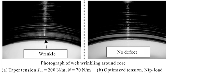Figure 10 shows a photograph of two rewound webs. The rewinding conditions and web conditions are equivalent to the conditions shown in Figure 9 and Table 1. In Figure 10(b), we can see that there are no wrinkles when the optimal rewinding conditions are applied. In contrast, as shown in Figure 10(a), wrinkles occur near the roll core under conventional rewinding conditions. Even though wrinkles may not be easy to confirm visually, with functional materials such invisible wrinkles often make the quality of the product unacceptable.