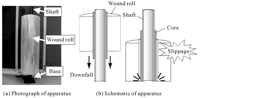 Next, we conducted drop tests to compare the slip resistance force. Figure 11 shows a schematic of the drop test. This device has a structure that drops the roll along a shaft. In this test, we ensured free-fall from the same height for rolls rewound at each tension and compared the appearance after impact.