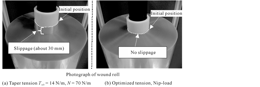 friction. In Figure 9(a), the taper tension is given a reduction rate of 30 (%). This value is determined based on the wrinkle and slip occurrence conditions, and has come into broad use through trial and error. Moreover, the nip-load for the taper tensions in Figure 9(b) is N = 70 (N/m) (an empirically determined fixed value).