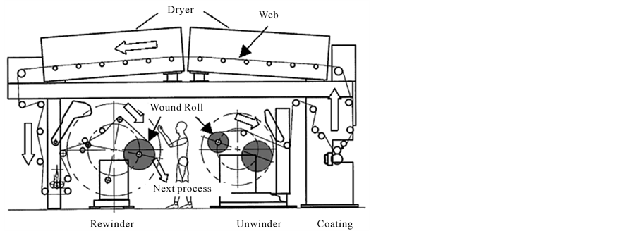 Figure 1 shows a schematic of the web-based manufacturing machine that is the subject of this research. The machine is composed of an unwinding unit, a coating (printing) unit, a drying unit, and a rewinding unit.