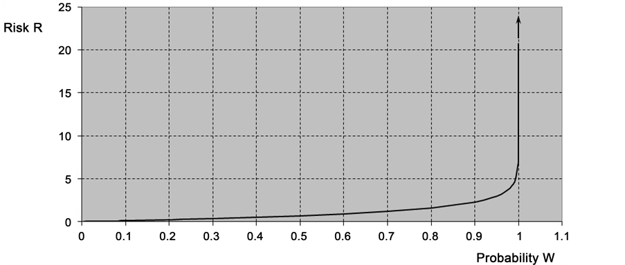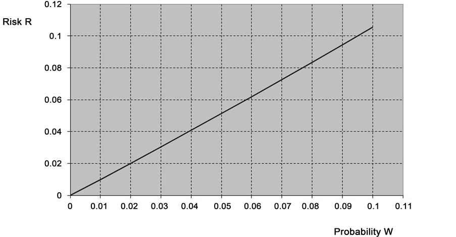 For low probability, risk R is approximately equal to probability W, i.e. R ≈ W (Figure 1(b)).