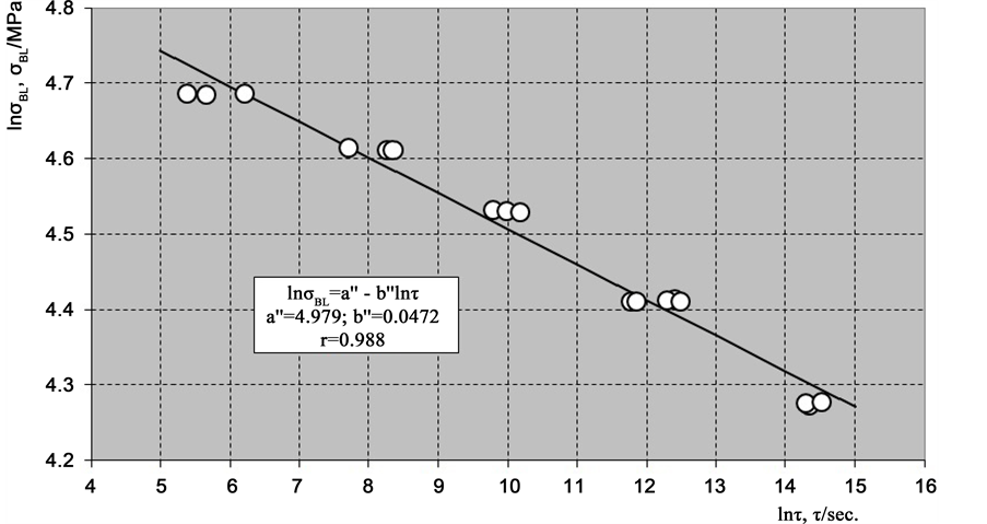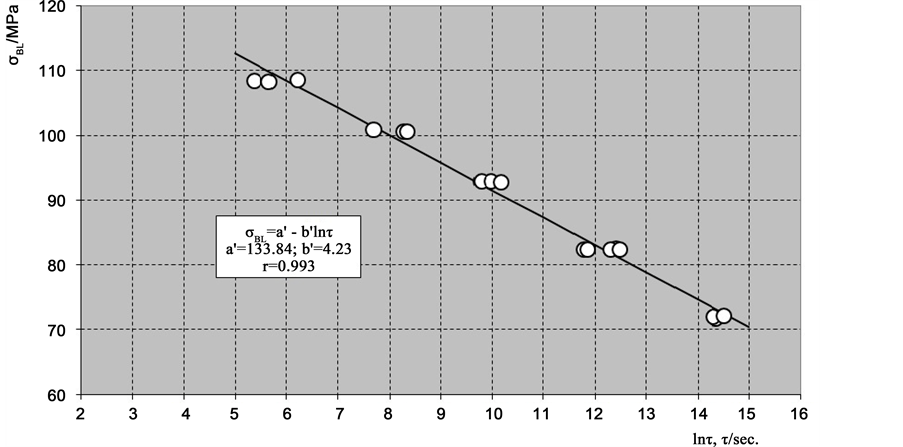 Long-term strength in creep as a function of specimen lifetime (time to fracture) according to Equations ((20') and (21')) is shown in Figure 7 and Figure 8.