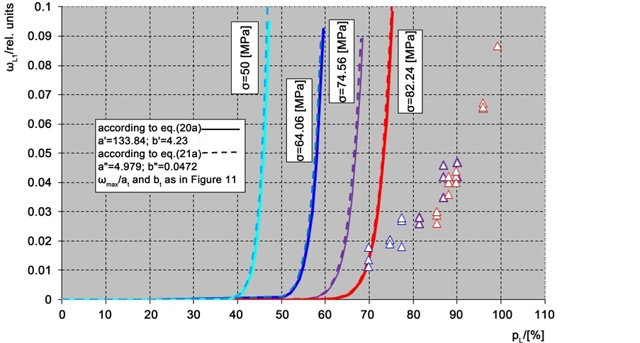 It follows from Figure 10 and Figure 12 that the calculated damage presented as a function of loading degree at four constant stresses does not agree with the experimental data.