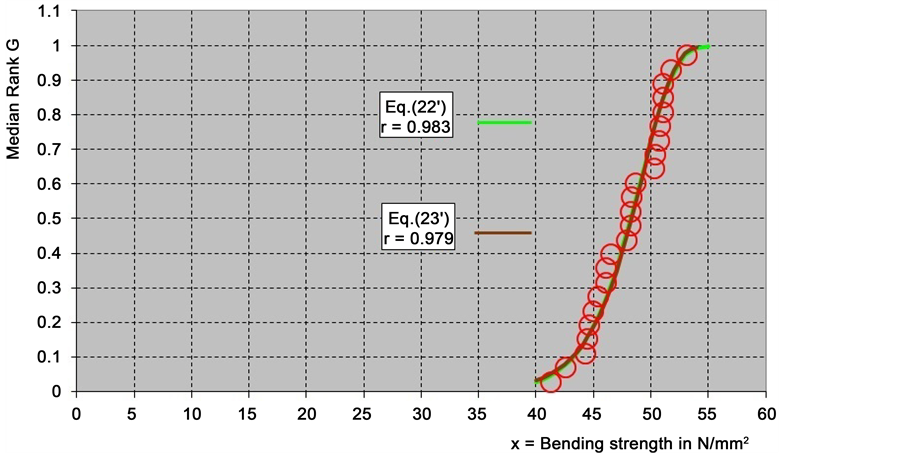 Equations ((22') and (23')) may be employed to approximate the cumulative functions of the bending strength of float glass [8] (Figure 17), lifetime of electron tubes [8] (Figure 18) and lifetime of turbine engines [9] (Figure 19). Large correlation coefficients are found.