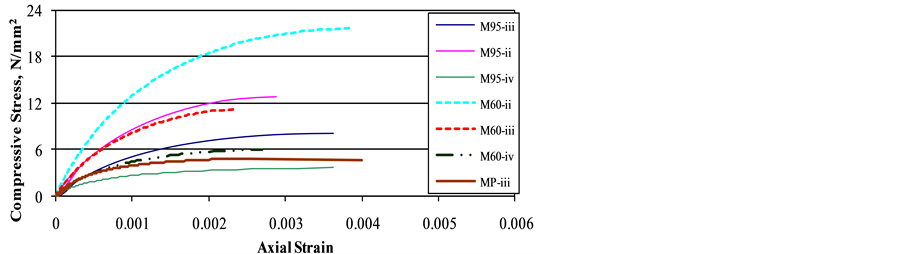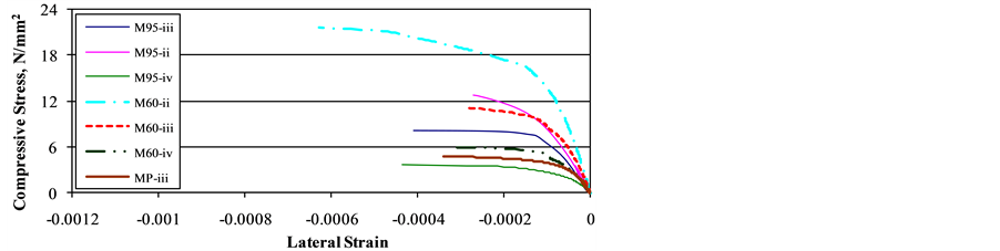 It is seen in Figure 4 and Figure 5, which compare the stress/strain curves for the axial strain and lateral strain respectively, that the M60-ii and M95-ii mortars were the stiffest and showed a more brittle response than the less stiff M95-iv and M60-iv. However from Table 1, the stiffness of M60-iv and MP-iii were found to be similar even though MP-iii is a designation (iii) mortar.