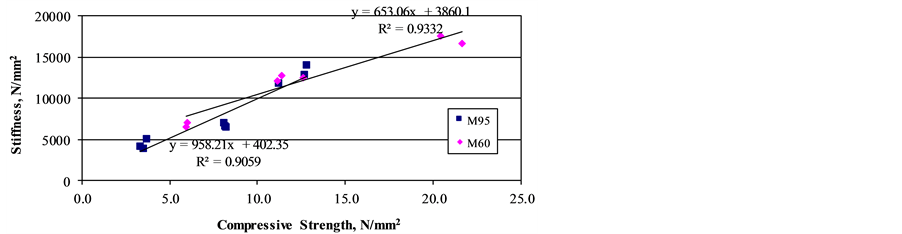 The stiffness/strength plot in figure shows a very good linear correlation between stiffness and compressive strength for both M95 and M60 mortars. The regression equation for the M95 and M60 mortars are shown in Equations (1) and (2) respectively. The respective values of the R2 are displayed on the chart. From the values of the R2 for both mortar types, there is strong evidence of a linear correlation between the stiffness and compressive strength.