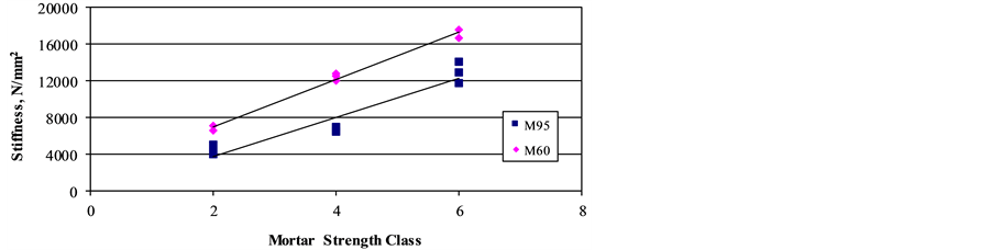 From the stiffness/strength plot in Figure 6 and the stiffness/strength class plot in Figure 7, it is seen that there is a much greater difference in the stiffness between the strength classes in the M60 mortar than in the M95 mortars. For instance there is a 51% percentage increase in stiffness between M95-iv and M95-ii, while the percentage increase in stiffness between M60-iv and M60-ii is 150%. This shows that the coarser grading of the sand in the M60 mortars is more receptive to increase in cement content as discussed earlier. Across strength classes, it is seen that for the M2 strength class the mean M60 mortar stiffness is 2300 N/mm2 higher than the corresponding M95 mortar stiffness. While for M6 strength class, the mean M60 mortar stiffness is 4100 N/mm2 more than the corresponding M95 mortar stiffness. This indicates that even for suitable model sands, the stiffness and strength properties for the same designation of mortar could be different. The stiffness of MP-iii was determined to be 6300 N/mm2; which is about 3% less stiff than the M95-iii mortar and 86% less stiff than M60-iii mortar.