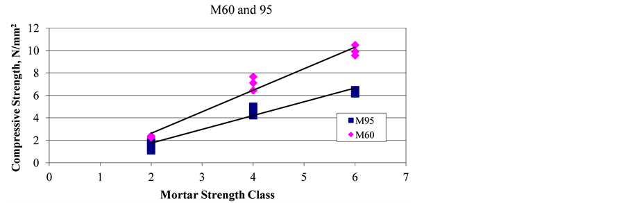 As expected it can be seen from Figure 2 that the relationship between compressive strength and strength class is a linear relationship. For designation ii, (class M6), there is a 60% difference between the compressive strength of the M60 and M95 mortars. While for designation iv (class M2), there is also a similar difference of about 58%. Because of the coarser grading of the HST 60 sand, it has higher a bulk density and thus a lower water to cement (w/c) ratio than an equivalent weight of HST 95 sand, which subsequently increases the compressive strength of M60 mortars. The wider divergence at higher mortar grades could be attributed to the greater quantity of cement available for making a more cohesive mix in the case of HST 60 mortar, which has coarser grading of sand. Therefore there is better cohesion between the coarse sand grains and finer cement grains. An investigation into the effects of grading on mortar properties by Anderson and Held [4] also yielded similar results; the sand with coarsest grading within the BS EN 13139 [5] limit gave higher compressive strength as a result of the lower w/c ratio.