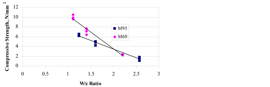 The variation of compressive strength with w/c ratio as shown in Figure 3 shows a decrease in compressive strength with increasing w/c ratio. It is also seen from the plot that at about a compressive strength of 3.5 N/mm2 (grade iii mortar) the two mortars have the same value of w/c ratio of around 2. The plot also shows that the mortars with coarser sand (M60) are affected more by changes in w/c ratio than mortars with finer sand (M95)