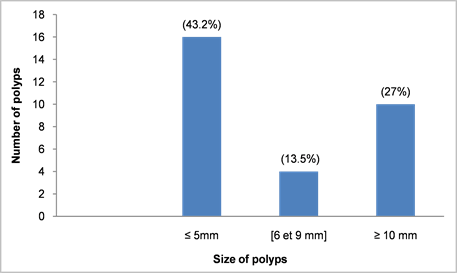 The average size of the polyps was 6.87 mm [2 - 15 mm]. It was not specified in seven cases (16.2%). It was less than 10 mm in 56.7% of the cases (Figure 1).