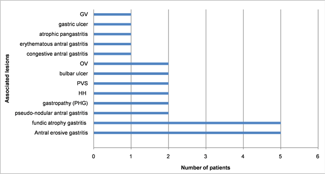 Chronic atrophic gastritis (10.8%) and intestinal metaplasia (10.8%) were the main associated histological lesions (Table 2).