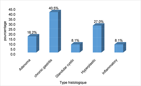 Histological examination was in favor of chronic gastritis known as chronic pseudo-polypoid gastritis in 40.5% of cases, hyperplastic polyps in 27% of cases, adenoma in 16.2% of cases (Figure 3).