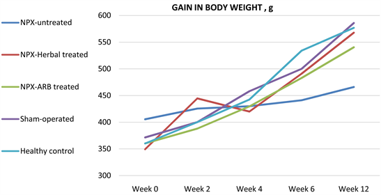 Table 1 and Figure 1 present the body weight (BW) of rats measured currently during the study. Increase in weight was smaller in untreated NPX group and the animals significantly smaller at the end of the study (p < 0.05) in untreated group compared with Herbal or ARB group. From NPX group 3 animals and from Herbal group 1 animal died before the end of the study, so these data was excluded from the results. Figure 1 illustrates increase of BW of study groups in timeline.
