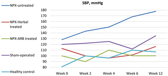 Table 2. Systolic blood pressure (SBP, mmHg), from week 2 on the difference between untreated NPX group and other groups was significant (p < 0.05). Sham operated and Healthy animals serve as illustrative controls.