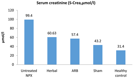 Serum creatinine elevation was noted in all NPX groups compared with healthy controls and sham operated groups, the elevation was most prominent in the NPX group, although not significantly different from other NPX groups