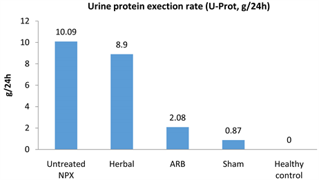 Figure 4. Urinary albumin excretion (U-Prot) was also increased in all NPX groups, but was significantly reduced in the ARB and Herbal treatment groups, compared with untreated animals (p < 0.05).
