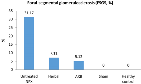 Figure 5. FSGS at the end of the study. Significantly less less glomerulosclerosis was found score was both in ARB-group and herbal group compared to untreated group.