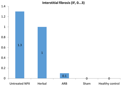 FSGS and IF estimation in kidney tissue samples of NPX rats revealed that significantly less glomerulosclerosis was found and IF score was lower both in ARB-group and herbal group compared to untreated group as shown in Table 4, Figure 5 and Figure 6.