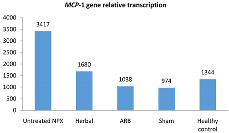 Figure 7. Quantitative RT-PCR analysis revealed that the differences of mRNA transcription for MCP-1 between ARB treatment and untreated group were statistically highly significant (p < 0.001), gene transcription was more than three times higher in untreated animals. Differences were revealed between herbal therapy and untreated group, being higher in untreated animals (p < 0.05).