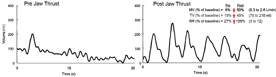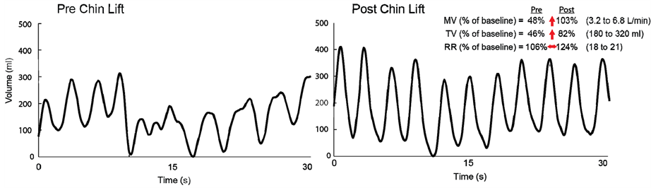 For each analysis, MV, TV, and RR were evaluated both as absolute values and as percentages of baseline ventilation. The average population estimates of these values are presented in this manuscript as mean ± standard error of the mean (SEM). Airway maneuvers were analyzed separately according to type of maneuver: jaw thrust or chin lift. All jaw thrust maneuvers were pooled and average MV, TV, and RR were calculated pre- and post-maneuver. Similarly, all chin lift maneuvers were pooled and average MV, TV, and RR was calculated pre- and post-maneuver. Paired t-tests were used to reject the null hypothesis that a maneuver resulted in no-change in ventilation (post-maneuver values were compared to pre-maneuver values).